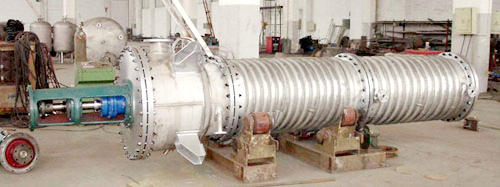 加热筒身内壁经专用机床加工和抛光,且与两端法兰连接面一次加工而,保证设备整体圆心度。经过抛光(必要时镜面抛光)的筒身内壁光滑洁亮,不易粘料和结垢,有效保证了设备的高传热系数。