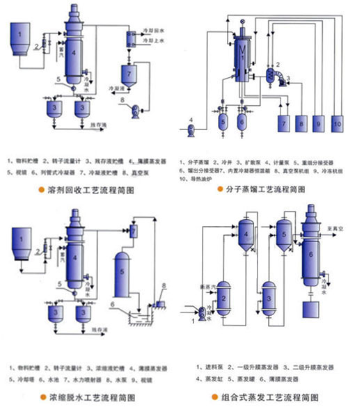 薄膜蒸发器可用作物料的浓缩、脱气、脱溶(溶剂回收)、提纯等化工单元操作、下列流程可供参考: